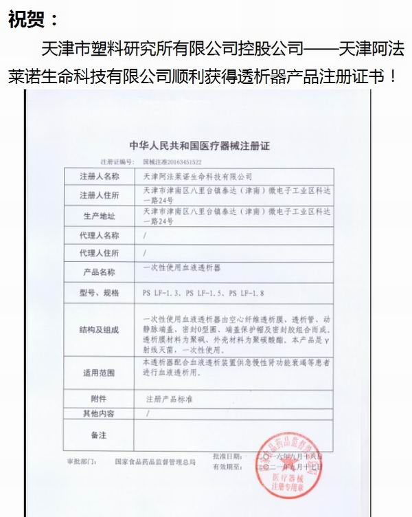 祝賀天津市塑料研究所有限公司控股公司—天津阿法萊諾生命科技有限公司順利獲得透析器產品注冊證書